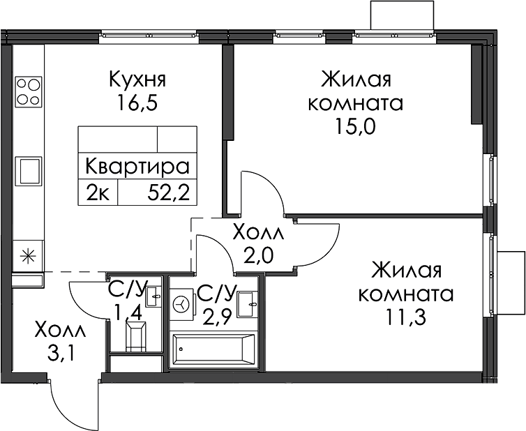 - Площадь52,2 м2