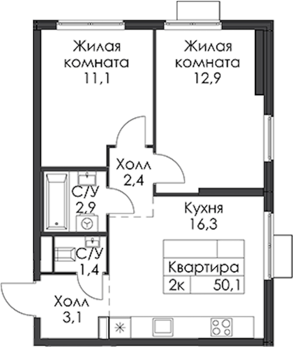 Двухкомнатная квартира на 24-ом этаже 50,1 кв.м